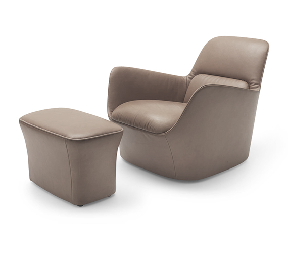 注重人體工學設計的一人座扶手沙發。可依個人品味與喜好特注腰間部與座椅部的皮革。參考價錢為扶手沙發與墊腳軟凳的價錢。