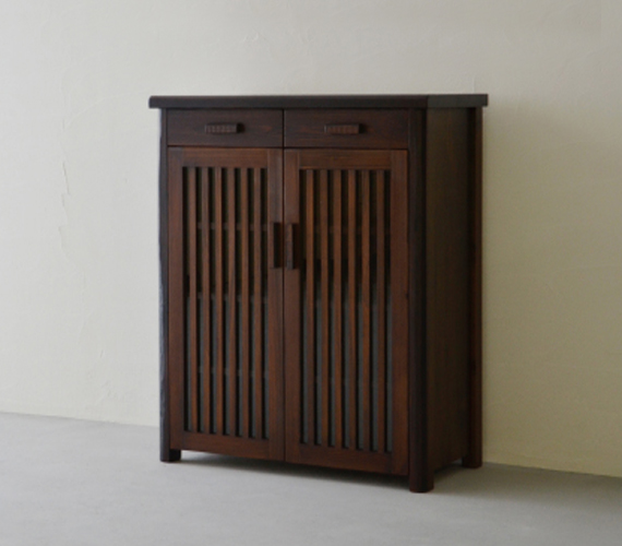 由日本古材傳統工匠所精心製造的木櫃。櫃子的格子門搭配玻璃面板的現代造型。櫃子附有兩個方便使用的抽屜適合擺設於客廳或是當做電話台。