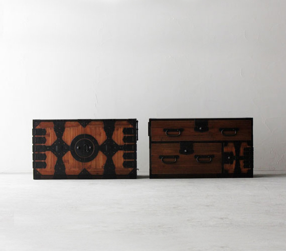 這組日本傳統時代矮櫃設有簡單的扣鎖設計,方便使用。可以把兩組左右搭配也可把兩組上下疊在一起使用,具有玩心的作品。